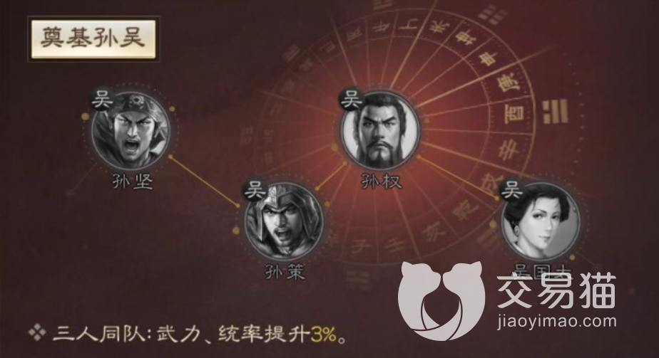 孙坚作为孙吴政权的奠基者,在游戏中还增加了队伍系统,如果是同样身为孙吴政权的奠基者,那么当三人同时在队伍中的时候,所以人的武力、统率能力都能够提升3%。
