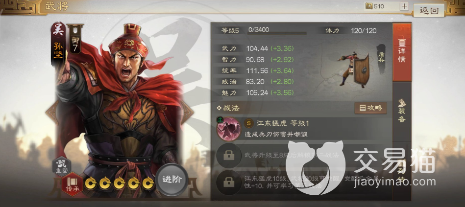孙坚作为孙吴政权的奠基者之一,从面板上来看武力值是属于中等偏上的存在,而且在统率方面也是高于同类型的角色,最重要的魅力值是游戏中顶尖的存在,但是由于所率领的队伍是盾兵,所以在攻击能力方面显得不足。