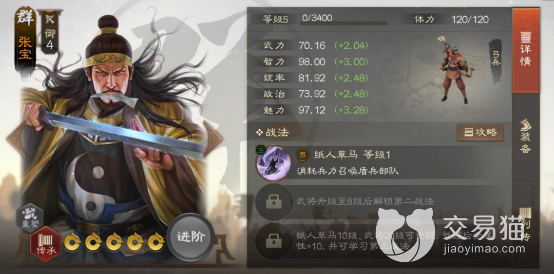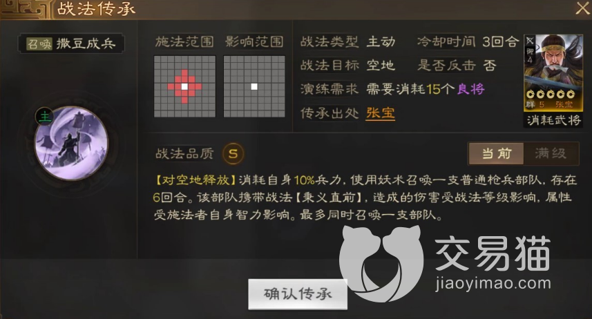 传承战法是撒豆成兵,大家传承以后可以召唤出来枪兵的兵队,这个技能在上面是比较强的一个技能,因为等于间接拥有了另外一队小兵,张宝可以跟张角、张梁以及卞喜、张燕还有张曼成组成黄巾起义的组合哦。