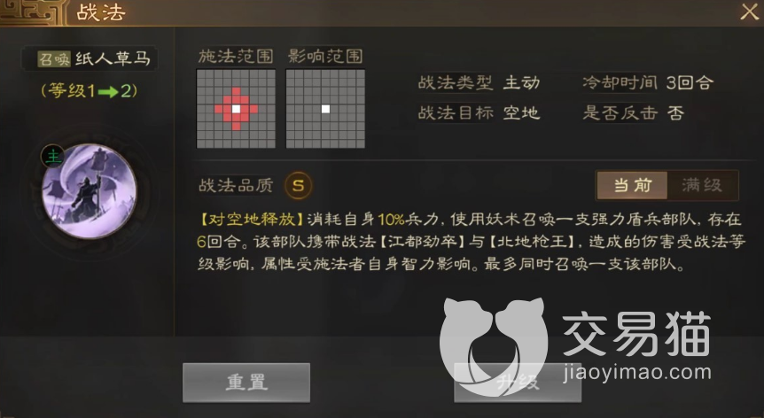 张宝的基础星级也是五星,所以用起来还是比较有底气的,至少在属性上面没有拉太多的后腿,一战发纸人草马属于一个主动技能,使用的时候是要对着空地使用的,才能够对周围造成影响,使用的时候可以直接召唤来一只盾兵,为大家带来高防御的效果,不过就是冷却的时间需要三个回合,时间上有点长。