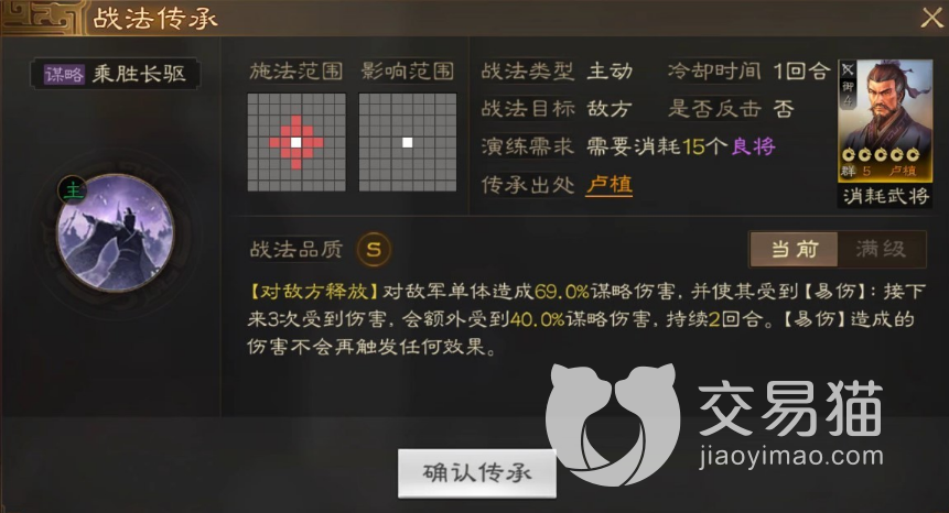 传承了战法以后就可以使用乘胜长驱技能,这个技能也是能够造成单体伤害,以及谋略伤害,但是在单体伤害上是提升了很多的,能够造成百分是六十九的伤害,谋略伤害的数值下降,但是回合是延续两个回合。