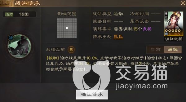 她的倾国技能可以将角色的恢复效果提升10%,而且在每回合都能恢复其队伍中的兵力治疗率提高34%,这些数值是受到角色智力影响的,效果会持续两个回合。