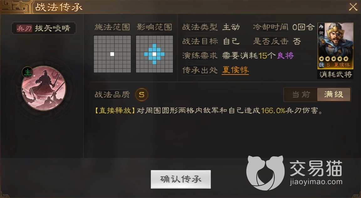 传承战法“拔矢啖睛”,可以对周围2格范围内的敌人与自身都造成伤害,奶量充足的情况下可以用,不然控制不当容易暴毙。其他战法推荐从固若金汤、力挽狂澜、猛志常在中挑选,不论是加伤害还是加坦度选择其中一个。