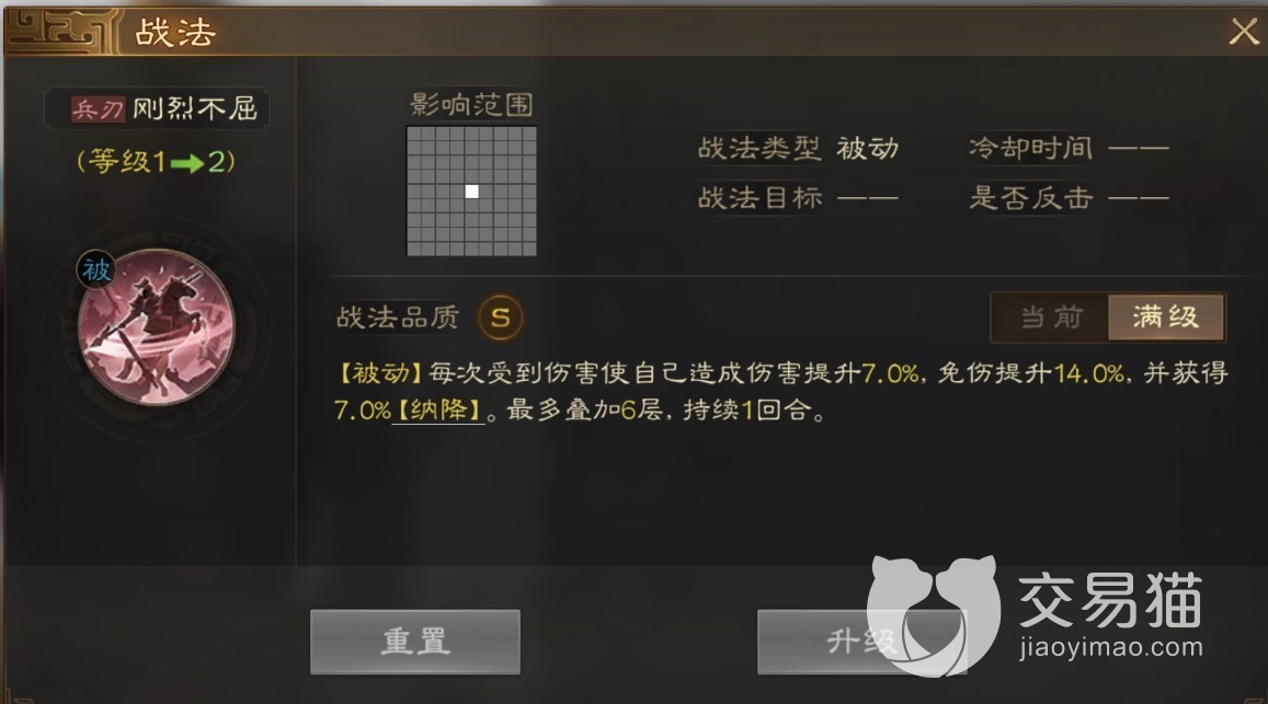在这个游戏里夏侯惇统帅骑兵,有着超高的武力、统帅、魅力属性。自带战法“刚烈不屈”为被动技能,每次受伤都可以使自己获得7%伤害加成和14%免伤以及7%的纳降,最多可以叠6层,但仅持续1回合,所以如果想要延续该技能效果,需要每回合都让其能够承受伤害,相应的奶也要匹配上。