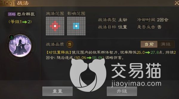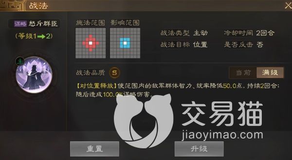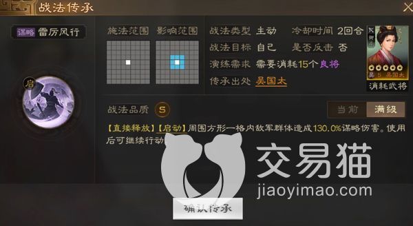 她的第二个战法叫做雷厉风行,可以对周边一格以内的敌人,直接造成130%的谋略伤害,但这个使用完后,角色就能正常行动了。