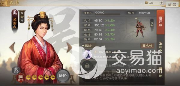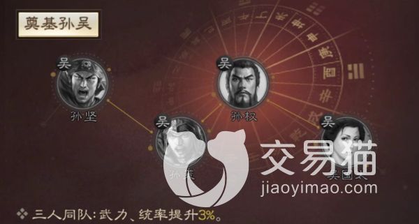 在这个游戏中,吴国太的强度算是中等的,并不是特别高,所以需要高输出的角色与其搭配,才能发挥出她最高的效果,也就是图上的三孙,图片中的四个角色只要拥有其中三个在同一个阵容中,就能让他们的武力和统率都提高3%,让他们的输出效果得到进一步提升。
