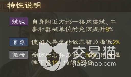 娄圭的特性“筑城”可以提升建筑工事和器械单位的免伤,使陷入异常的敌人智力降低。如果与袁绍、淳于琼同队,还可以得到武力和智力的双重加成。