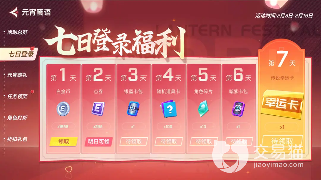 首先可以知道的是这个个活动在2023年2月3日便会正式开启,这个活动一共会持续16天的时间。首先比较熟知的便是签到活动,各位每日登陆游戏都可以获取到一些小的奖励,在第七天的时候还可以领取传说幸运卡。