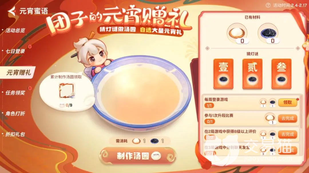 在这次活动开始的后一天,各位可以通过完成任务或是猜这里的灯谜,来领取制作汤圆的材料。这里的汤圆还有三种口味可以进行挑选,每一种里面都包含了不同的礼物。如果各位累积做出了九份汤圆,还能够领取到这个节日限定的头像框。