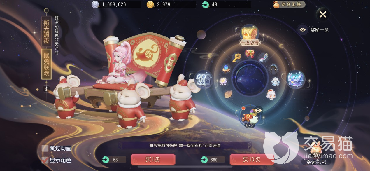 本次的活动是为了顺应新春气象的,所以里面有一个活动的内容是鼠兔联欢玩法。这里主要的游览方式就是进行抽奖,各位只需要花费一定量的金额,就会有一定几率获取到兑换券。在这里的奖励中还有限定的成就特效返场的坐骑。