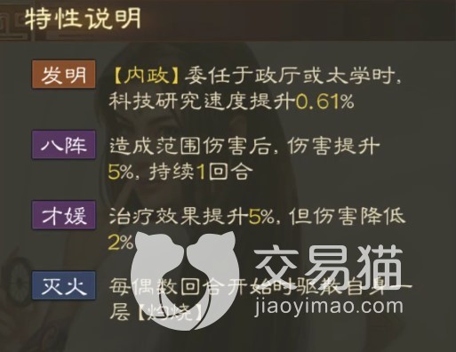 同时推荐搭配一些其他主动类的技能,来覆盖自身战法的冷却回合(2回合),例如兵疲意阻、智计等等。此外特性可以提升AOE伤害、治疗效果(如果搭配上一些治疗类的技能)、驱散灼烧(略微克制火烧队),作为内政人员委任时还能加速科研。