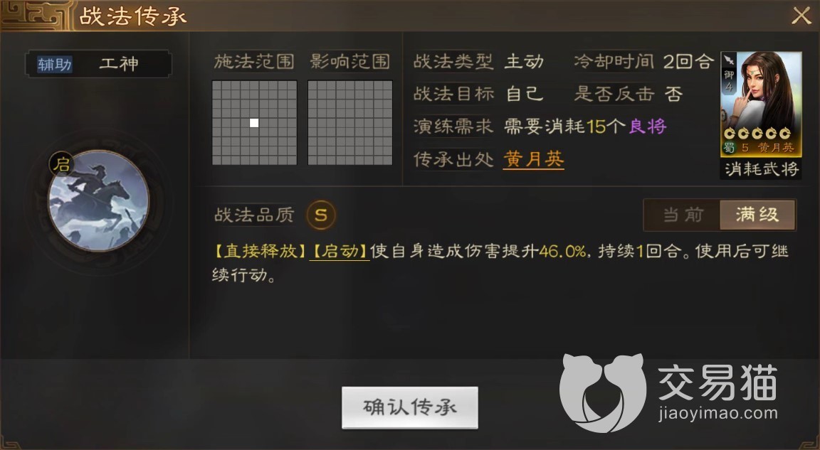 传承战法“工神”属于进场就有效的技能,可以提高自身伤害并在使用之后继续行动,“再动”这一效果也能让黄月英为队友提供更为及时的支援,同时自身也能规避掉敌军的追击。