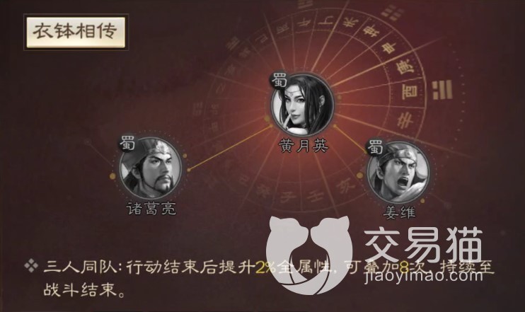 同诸葛亮、姜维同队的时候,每回合行动结束后可以获得2%全属性提升,最高叠8次。超高的智力使得黄月英的谋略伤害也不低,自动战法能给队友提供高额增益,而再动则可以让其在释放战法后获得有效的规避,无论是搭配输出大核还是前排肉坦都有很高的战略价值。