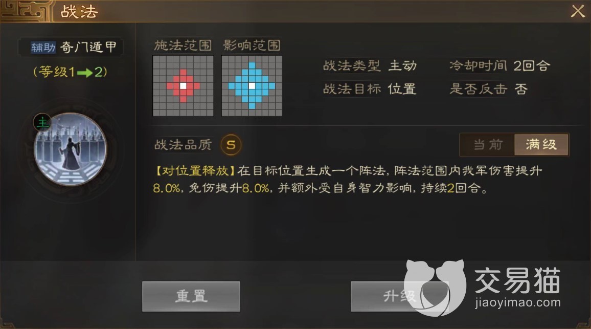都说黄月英的才智能与诸葛亮相匹配,这一点在游戏里也有体验。统率枪兵的黄月英有着100+的智力属性,除开武力值,其他属性也较为均衡。自带主动战法“奇门遁甲”可以在目标位置生成阵法,从而给范围内友军提供伤害与免伤加成,并且该加成还会受黄月英的智力加成,因此比面板上写的8%还要更高。