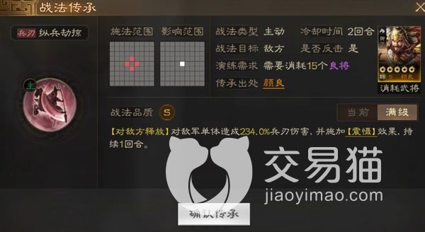他的纵兵劫掠技能直接对敌方单体造成234%的兵刃伤害,该伤害除了减少敌人血量之外,还对敌人增加震慑效果,该效果将会敌人持续一回合。