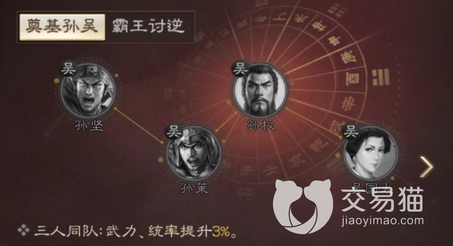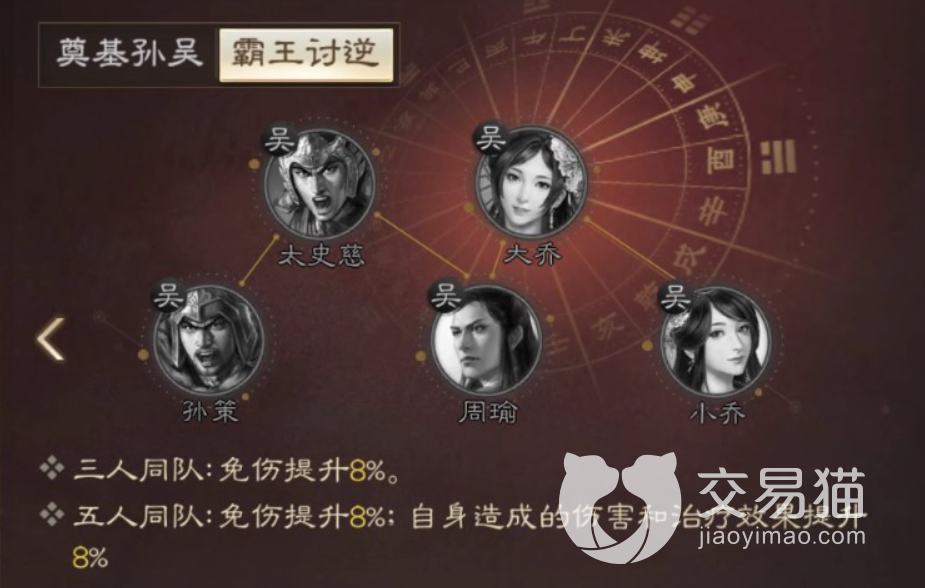 在游戏中孙策一共有2中不同队伍属性加成,比如“霸王讨逆”队伍中有孙策、太史慈、周瑜、小乔、大乔,当这些武将同属于一个队伍中的时候三人可以提升8%的免伤能力,如果是5人的话还会将造成的伤害8%转化成为治疗效果。而奠基孙吴队伍则三人同队的话只能增加3%的武力和统率能力。