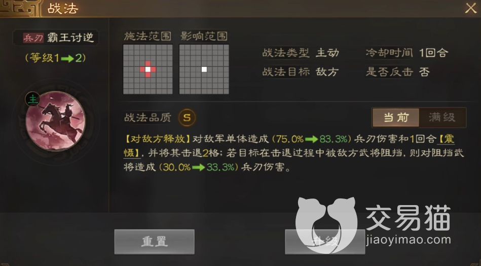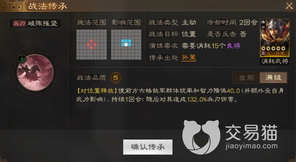 从游戏中的属性面板中可以看出孙策的武力值在一流武将中也是顶尖的,而从战法技能的角度可以看出“霸王讨逆”的技能不仅能够对敌人造成大量的宾根伤害,而且在回合中还能够起到震慑效果使对面后退两格,如果对方的武将不后退的话那么武将还会受到60%的兵刃伤害。而“破阵催坚”技能则可以使均能范围内的所有敌军统率和智力都下降40点,如果自身的武力值越高那么减少的属性也越多,同时还会造成大量伤害。