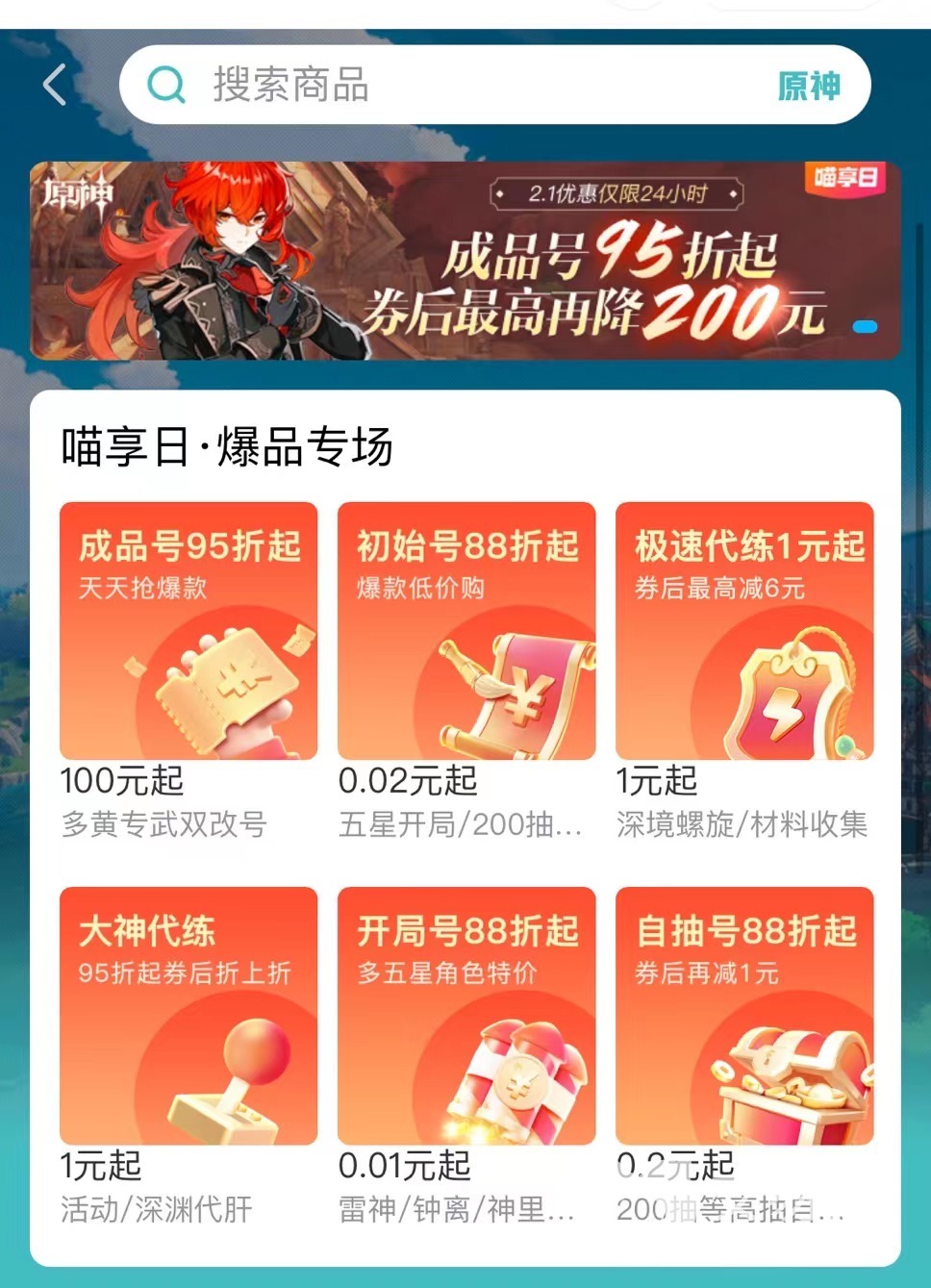 1、不定期专享福利。喵享日活动,虽然活动时间短,但是力度大,有88折的折扣力度。在交易猫上会有不定期的这种活动,对于想要买原神自抽号的玩家遇到这样的活动就不要错过了。不过就算了错过了活动也不要紧,可以等待下一次活动或者关注一下原神自抽号交易市场,交易猫上原神自抽号的价格也是很合理的。