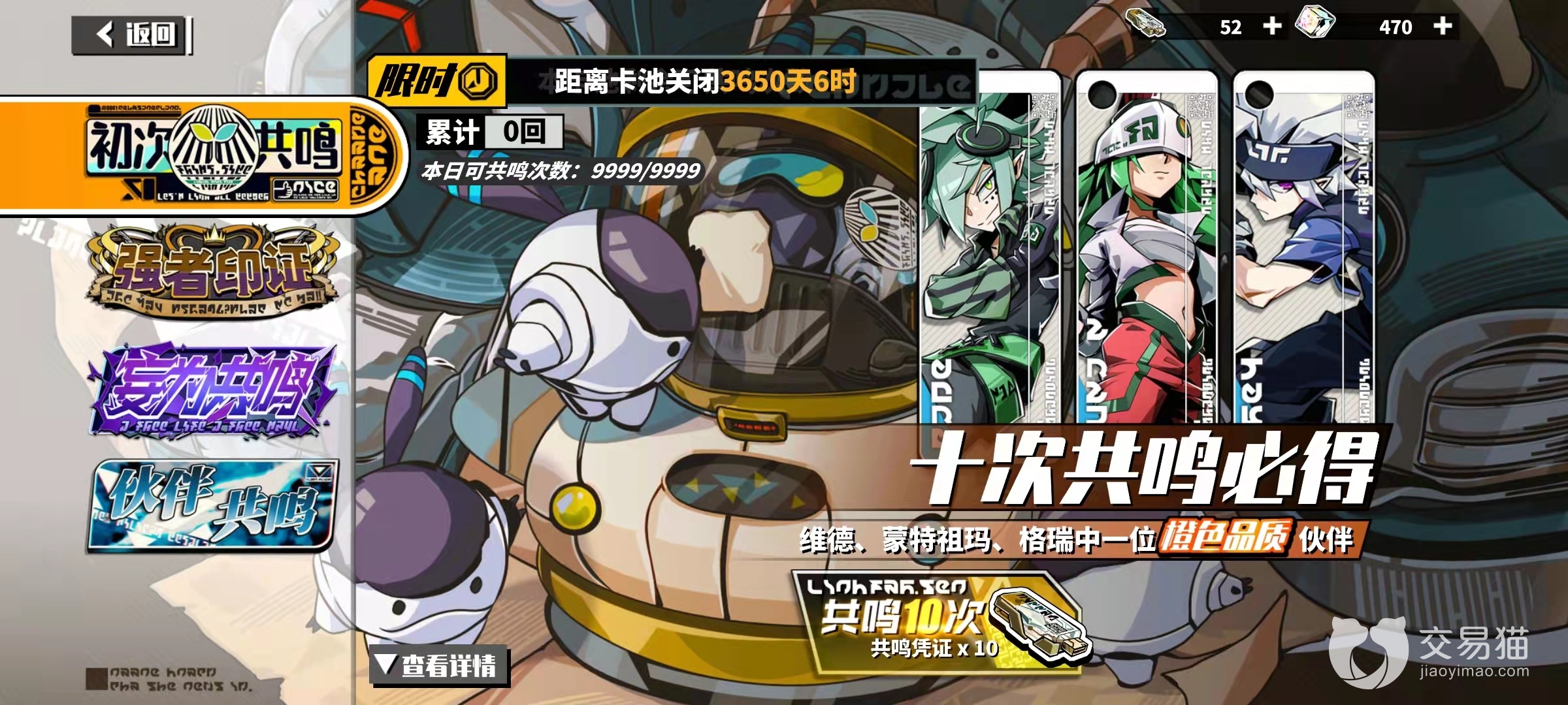 通过点击主界面右下角黄色背景的“共鸣”选项即可进入对应的抽卡板块,如果你是新手的话,里面会有四种卡池,其中最上面的这个“初次共鸣”就是新手卡池了,与其他几乎要近百次才能出橙卡的卡池不同,它只需要一次十连抽就能必出橙卡,当然,每个玩家只有一次机会抽取它,玩了很久都没抽它的话也不用担心它会过期,因为其持续时间长达十年。